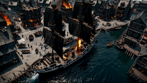 • Работорговцы узнали про корабль, который как-то прошёл через миры и решили от него избавится. Подговорили и подкупили капитана устроить поджог порта, отвлечь внимание, ограбить банк и свалить. Капитана зарезали, можно успеть спасти, он лежит под пирсом на песке.